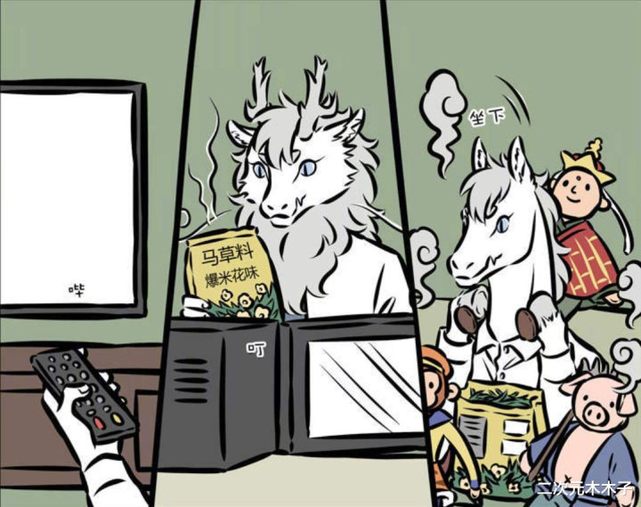 回家后的敖烈首先打开了电视机,接着找出最喜欢的马草料味爆米花,最后变成会白龙马的样子,开始美滋滋地看电视